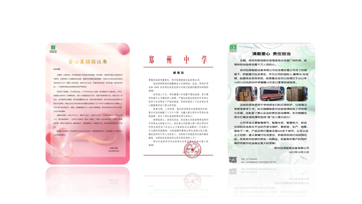 2010年公司成立之初,即向革命老區(qū)---河北省西柏坡華潤集團承建的紅色希望小鎮(zhèn)捐贈無線遠傳智能燃氣表及手持抄表設備、運營軟件、電腦等價值40余萬元的軟/硬件裝備。并舉辦愛心募捐活動、在抗疫斗爭中積極捐贈物資。